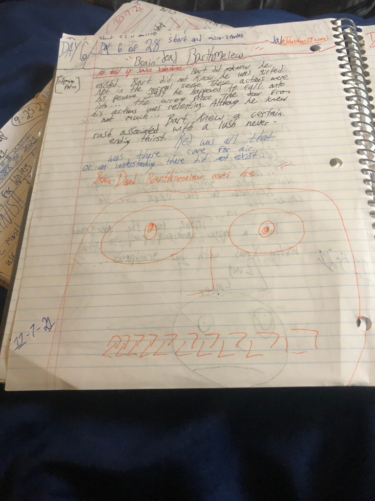 ” Bart did not know he existed. Bart did not know he was gifted. Not in the normal sense. These actions were his penance. 1984 he happened to fall onto… the wrong floor. The door from his actions was relenting… Although he knew not much … Bart knew a certain rush associated with a lush never-ending thirst. Red was all that was there…care for air…or an understanding there did not exist…Brain-Dead Barthomelew was he… “
