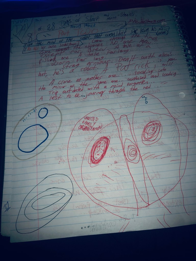 From the mind of the robot that wouldn’t stop losing his oil…(urine)[As told by Jake Johnstone:] ” Gone through the times. Gone through the rhymes. No one knew… except for Drew. A tale of a pissing one. A tale for long. Worn for long. Strong Armour. Dealt with aliens…but, he’s a robot. A Patrick; if you will…A clone of another one…looking into the mirror of the same one…confused and looking…Trip outdated with a mind forgotten…A lest to be… a journey through the red…”