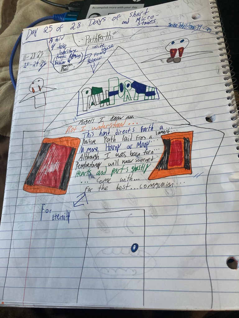 ” Angels I know not. Rot I understand… This hand directs forth a… … Positive Path laid from a lament… No More Harry or Mary… Although I was born torn… Pemberbury will know scorned… Hearts and parts ghastly… Come with… For the best… communion…” For Eternity”…
