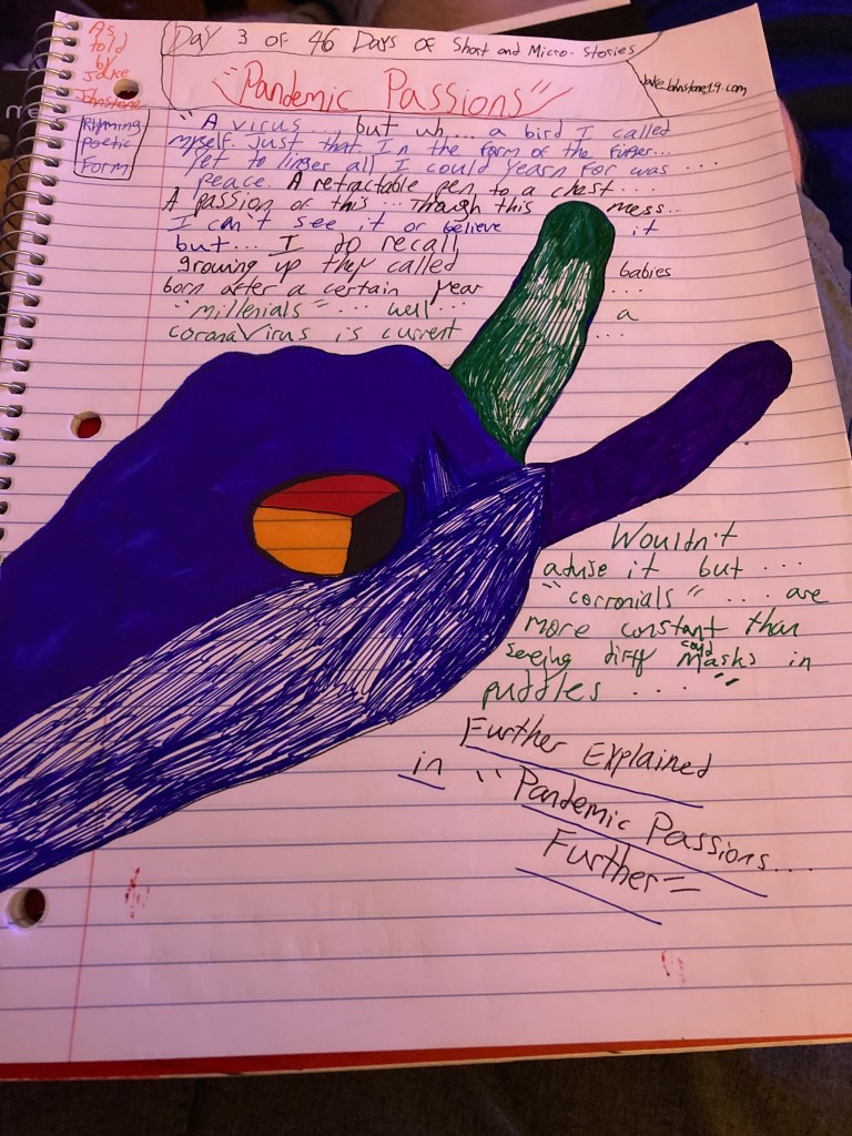 ” A virus … but uh … a bird I called myself. Just that. In the form of the finger … yet to linger all I could yearn for was … peace. A retractable pen to a chest … A passion of this … Through this mess … I can’t see it or believe it but … I do recall growing up they called babies born after a certain year … “Millenials” … Well … a CoronaVirus is current … Wouldn’t advise it but … “corronials” … are more constant than seeing dirty covid masks in puddles … “