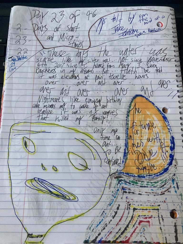 ” These days the water was scarce like my sister was … Not since November 4th, 2017 since I heard from Mary. I have seen Rancheros in my dreams … But … truth be told it was elevators of pain … twelve hours over … over and over … over and over … Nightmares like everyday birthday cake mirages only to wake up and realize it was 18 vampires that killed my family … Only my time ran out … ”