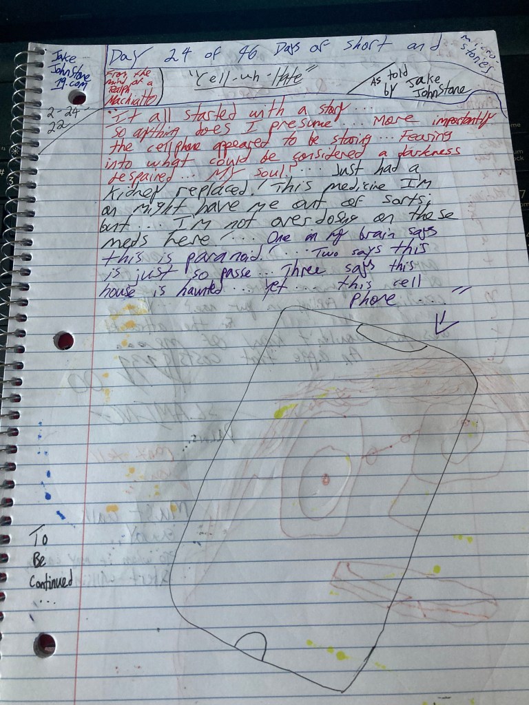 ” It all started with a story … So anything does I presume … More importantly, the cellphone appeared to be staring … Fearing into what could be considered darkness despaired … My soul? … Just had a kidney replaced! This medicine I’m on might have me out of sorts; but … I’m not overdosing on these meds here! … One in my brain says this is paranoid! … Two says this is just so passe … Three says this house is haunted … yet … this cell phone … “