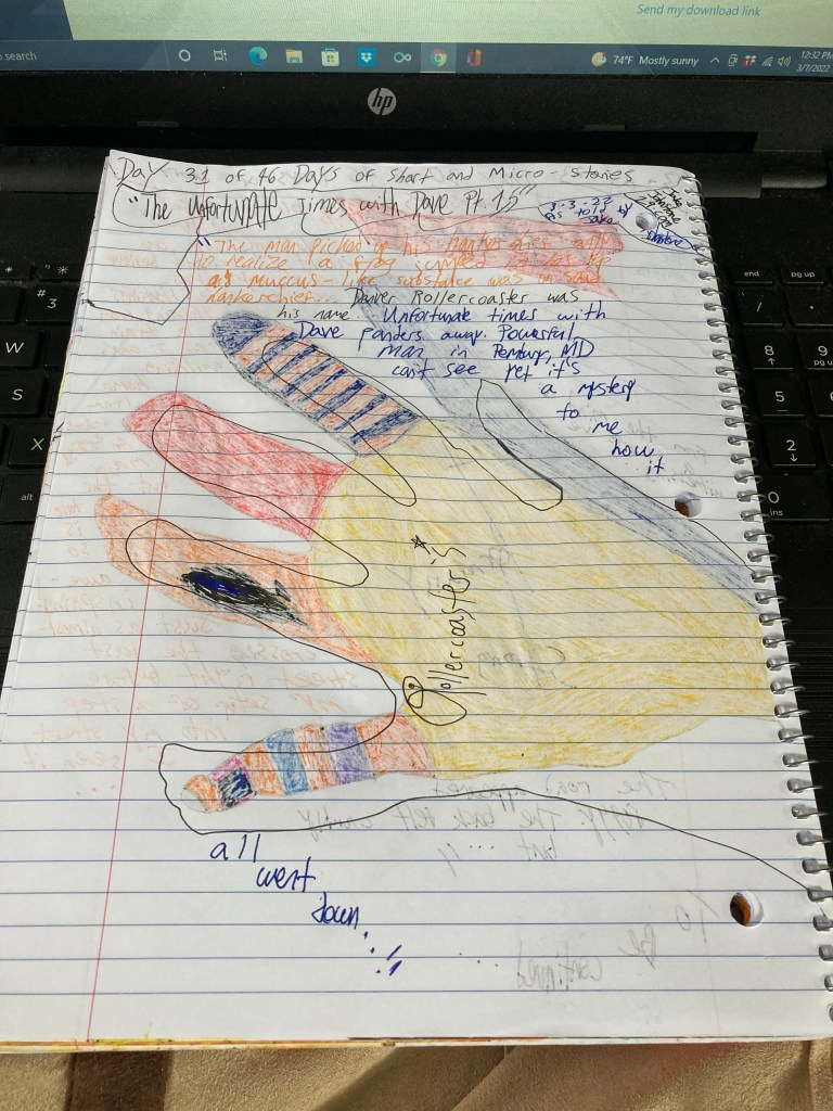 ” The man picked up his handkerchief only to realize a frog jumped in his lap and mucous-like substance was on said handkerchief … Denver Rollercoaster was his name … Unfortunate times with Dave panders away. A powerful man in Pemberbury, MD can’t see yet it’s a mystery to me how it all went down … “