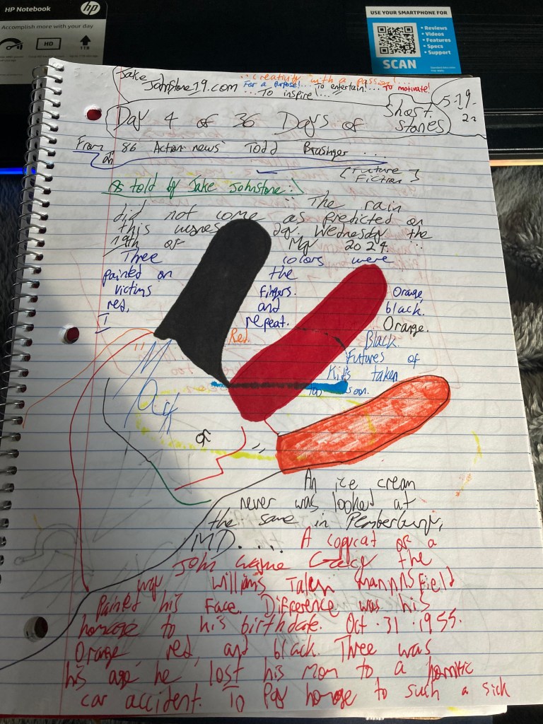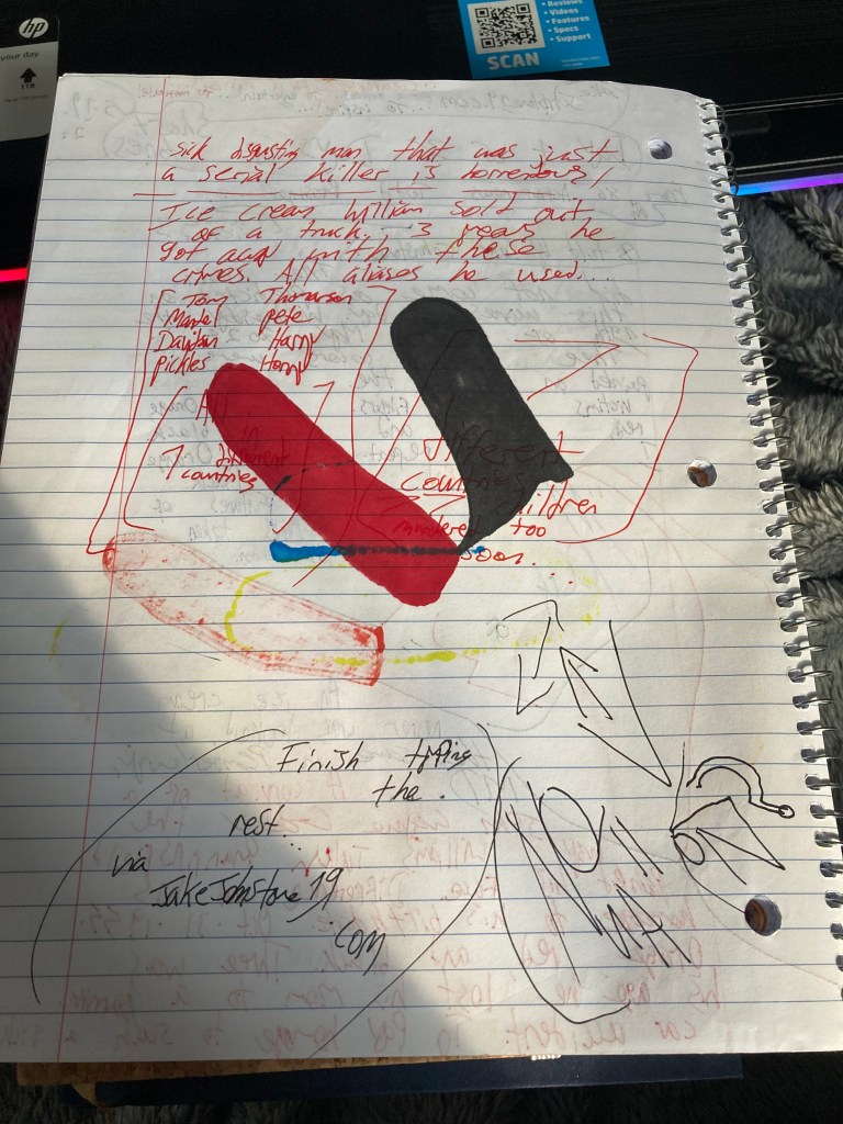 ” The rain did not come as predicted on this Wednesday. Wednesday the 19th of May 2024. Three colors were painted on the victim’s fingers. Orange, red, and black. I repeat. Orange. Red. Black. Futures of kids taken too soon. Ice Cream never was looked at the same in Pemberbury, Maryland … A copycat of a John Wayne Gacy the way Williams Talenn Mannsfield painted his face. The difference was his homage to his birthdate. Oct. 31, 1995. Orange, red, and black. Three was his age he lost his mom to a horrific car accident. To pay homage to such a sick sick disgusting man that was just a serial killer is horrendous! Ice Cream William Sold Out of a truck. 3 years he got away with these crimes. All aliases he used … Tom Thomarson … Mandel Pete … Davidian Henry … Pickles Harry … All from 7 different countries … children murdered too soon … ” [ At this point everything fades away … the screen goes grey and somehow 360,000,000,000 people al fall grey … and black … ]