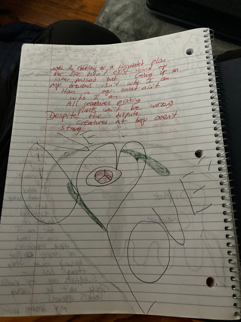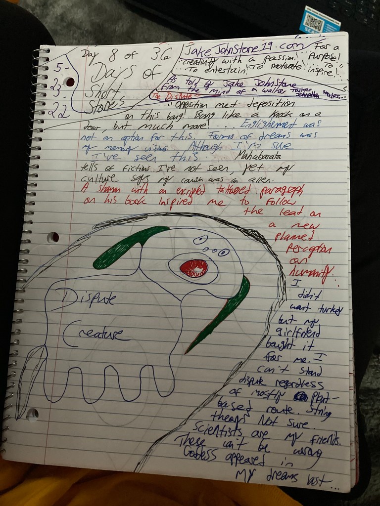 ” Opposition met deposition on this bang! Bang like a knock on a door, but much more!… Enlightenment was not an option for this. Forms of dreams were my memory visions… Although I’m sure I’ve seen this … Mahabarata tells of fiction I’ve not seen, yet my culture says my cousin was an alien. A shaman with an encrypted tattooed paragraph on his book inspired me to follow the lead on a new planned perception of humanity … I didn’t want turkey but my girlfriend bought it for me. I can’t stand disputes regardless of the mostly plant-based route. String theory? Not sure. Scientists are my friends. These can’t be wrong. A goddess appeared in my dreams lost I am but …that’s just last night I dreamt. An even flow of a circulated plan for life didn’t exist since my sister passed but … Giving up on my dreams isn’t who I am … Ham in my salad ain’t who I am … All creatures eating plants can’t be wrong. Despite the dispute. Creatures at bay aren’t strong. “