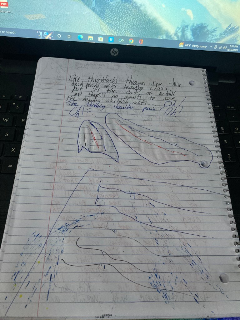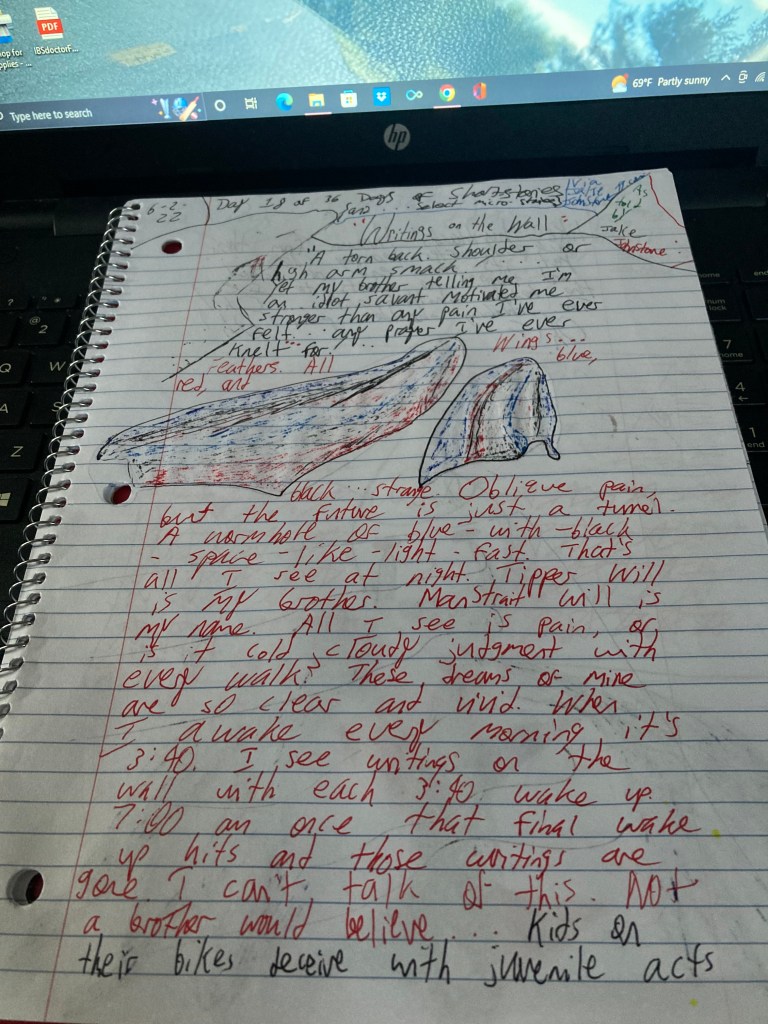 ” A torn back. Shoulder or high arm smack! … Yet my brother telling me I’m an idiot savant motivated me stronger than any pain I’ve ever felt … any prayer I’ve ever knelt … for! … Wings … feathers. All blue, red, and black … strange. Oblique pain, but the future is just a tunnel. A wormhole of blue-with-black-space-like-light-fast. That’s all I see at night. Tipper Will is my brother. Mannstrait Will is my name. All I see is pain, or is it cold cloudy judgment with every walk? These dreams of mine are so clear and vivid. When I awake every morning it’s 3:40. I see writings on the wall with each 3:40 wake up. 7:00 am once that final wake-up hits and those writings are gone. I can’t talk about this. Not a brother would believe it… Kids on their bikes deceive with juvenile acts like thumbtacks thrown from their backpacks after leaving class … Yet it’s the end of school and there are no adults to see the heinous childish acts … Oh! The throbbing shoulder pain! Oh! Oh! … ”