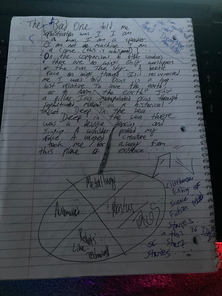 ” The Bad One told me sophistication, was I. I am a man. I am a speaker. [I am not a machine. I am a clone. (this is whispered)] … In comparison to other counties, there are no wings. Only worshippers of the sun. The sky. A beetle face on wings though. Isis resurrected me I was told. Osiris is a long-lost relative. To save the earth, or to harm the earth? Just a pillar. Isis manipulated Osiris through sophisticated means in a historical tablet. Deep in the sea … Deep in the sea there was a device dancing and singing. A whisker poked my face. A winged creature took me far away from this plane of existence … “