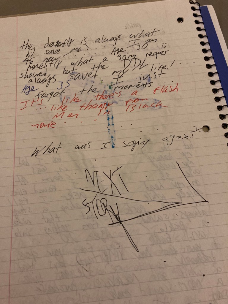 ” As I was telling my story … uh. I should say stories … well it’s a lot about one … This one is about [ D.D.L. ]! An acronym I gave it. Dead Dragonfly Luck I called it. D.D.L. became the abbreviation for what feels like my saving grace since the small age of 5! 5 years from that age on a day when the wind was slow and the birds were singing I recall a lonely black plastic bag just flying ever so carelessly. The music from a red pickup truck distracted me, but the box I had my dragonfly in was my lucky charm. At age 15 … I found flies on my head after I fell asleep while reading a story at the park one day I recall, but that nickel that I gave my Dad that day to buy the box for preserved dragonfly always saved me from getting into a pickle! … Age 20 … and fickel is far from your eyes to your foot how important this dead dragonfly is to me! Elegant like a white gold necklace purchase a mom could make for his son … At age 25 I recall no horrors to my memory but the dragonfly is always what did save me! … I am 46 now! … Age 30 is honestly what a grim reaper showed, but the D.D.L. always saved my life! … Age 35 … I just forget the moments … It’s like there’s a flash … like thangy from Men in Black movie … What was I saying again?” … … …