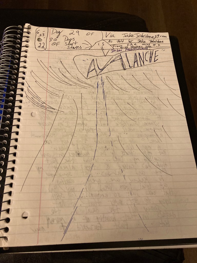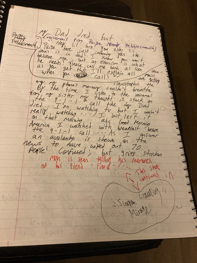 ” Voice-mails are getting claustrophobic the way my phone’s memory couldn’t breathe. By the time I listen to the voicemail from my sister my thought is stuck on the 9-1-1 call the day Dad died … I’m watching tv but I wasn’t really watching … I just left it on that morning … abc Good Morning America I watched with breakfast before the 9-1-1 call … As I answer an avalanche is shown on the news to have wiped out 70 people! Confused; but grief stricken man is seen telling his memories of his friend ‘ Fiore ‘! …”
