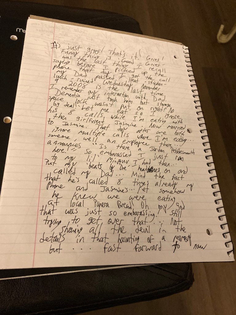 ” It’s just grief! That’s it! Grief! Funny thing is ‘ Good – Grief ‘ was the last thing I recall saying before I picked up the phone that day I got the call my Dad passed! Heat-stricken-lunch-ruined Wednesday November 9 2008 is the last time I remember any interaction with Dad. Dementia just took him but storage space lock wasn’t put on right? No big deal! ‘Let me eat’ so I ignore his 8 calls while I’m eating with then girlfriend Jasmine. Now married to Jasmine. That day after we both ignore multiple calls where I’m eating … someone, well an employee there … announces ” Is there a Jordan Pebblemsouth here?! ” so embarassed I just ran to my Volskwagen Jetta I had then … Put my lil’ earbuds in and called Dad … Mind the fact that he’s called 8 times already to my phone and Jasmine’s as well … Yet somehow he knew we were eating at local Panera Bread! Oh my god that was just so embarassing! Still trying to get over that … Not showing all the devil in the details in that haunting of a memory but … fast forward to now 2018 and the call I just received is my dad killed himself at the mental ward he was stationed at. Stationed? He was admitted! I’ll be frank here … Oh the horror I can’t understand … The devil was in him? I’m not even sure, but the dementia felt more evil … I just never wanted to believe it! None of it! Ignored anything mom would tell me before she passed from Lupus back in ’09! Just my sister Paige Mandy Pebblesmouth to try reason with me, or should I say inform me of the horrors in my Dad?! The devil is in the details I say! That saying I never could get! Sunshine left me … Sunshine left my presence about a year prior to this writing. Dark days make up the norm these days. Black shirts. Black pants. Black socks. Black shoes. Greys with baloon-bulletholed heads. I would call you crazy if you saw them … Yet my sister told me the following in a voicemail she left me just before my Dad’s suicide! … Sure enough I didn’t listen until after I found out my Dad died but … “