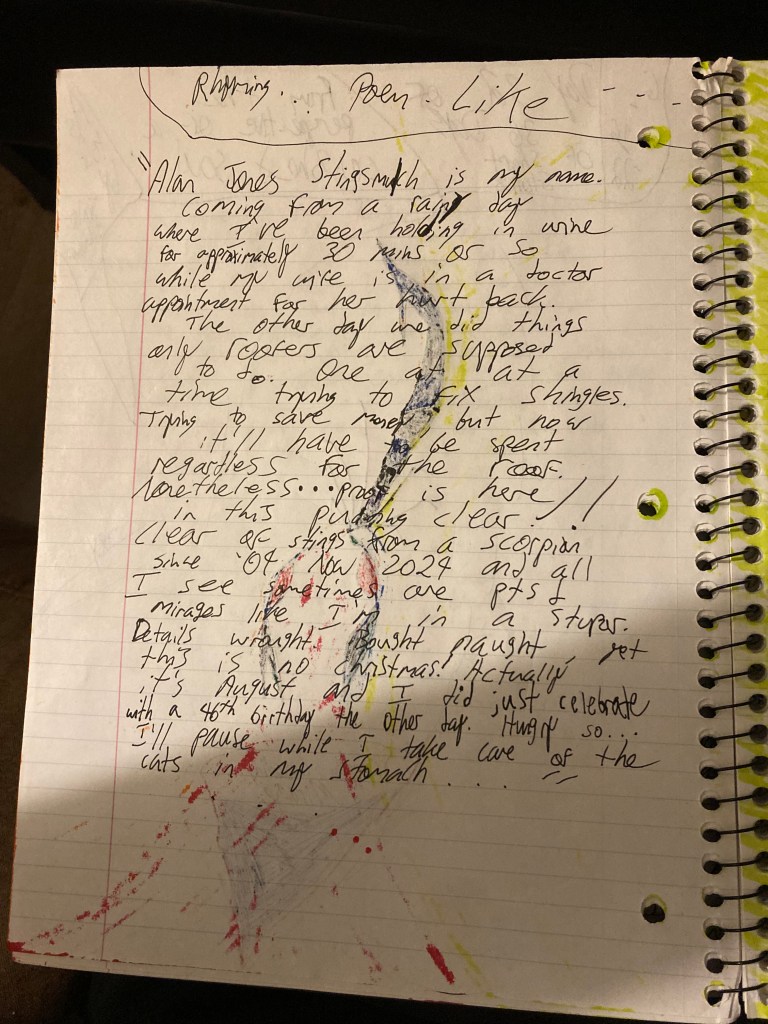 ” Alan Jones Stingsmulch is my name. Coming from a rainy day where I’ve been holding in urine for approximately 30mins or so while my wife is in a doctor’s appointment for her hurt back. The other day we did things only roofers are supposed to do. One at a time trying to fix shingles. Trying to save money, but now it’ll have to be spent nonetheless … the proof is here in this pudding clear!! Clear of stings from a scorpion since ’04 ‘. Now 2024 and all I see sometimes are PTSD mirages like I’m in a stupor. Details wrought. Bought naught, yet this is no Christmas! Actually, it’s August, and I did just celebrate my 46th birthday the other day. Hungry so … I’ll pause while I take care of the cats in my stomach … ”