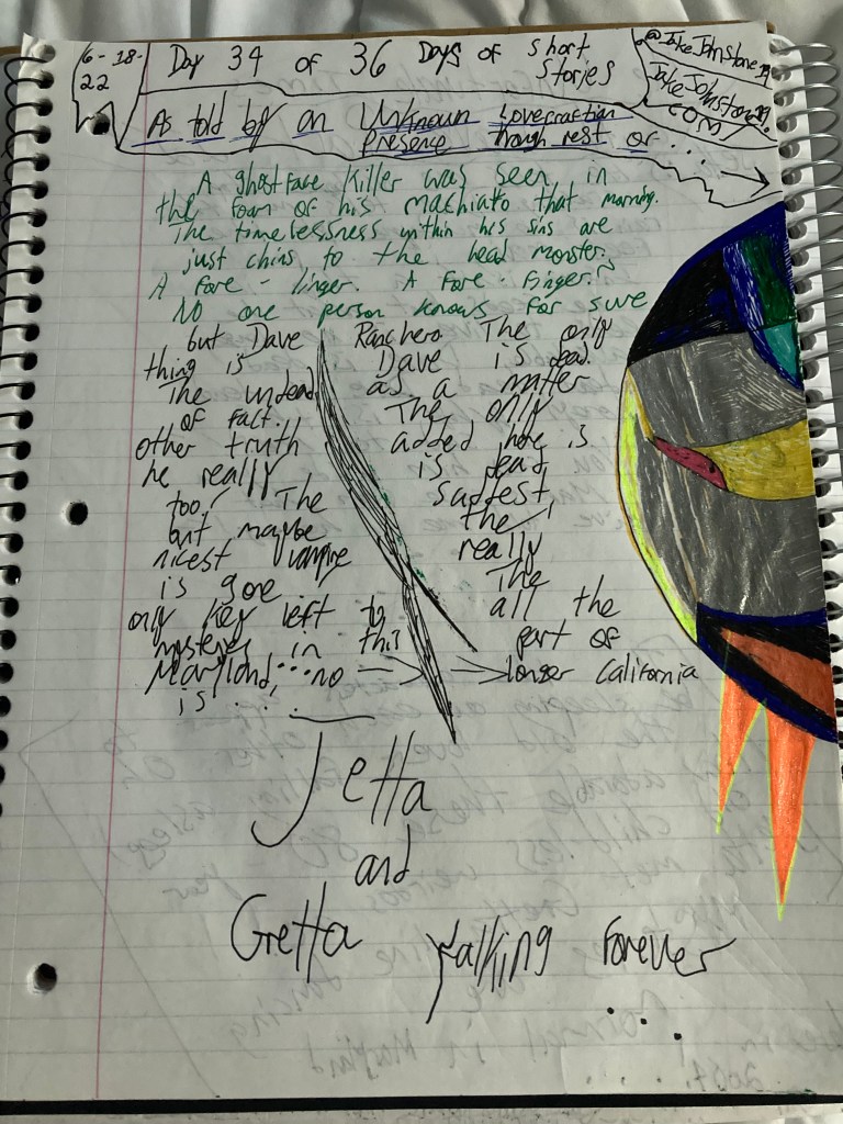 The story takes a shift as the Cthulu Vampiric Lovecraftian Creature somehow … teleports to ” Earth -Realm – Form ” as Jetta and Gretta are frozen holding hands. The creature crawls into the basement, walks down the stairs, and vanishes into thin air … Jetta and Gretta fall … Breathing again is Jetta and Gretta. Continuing about Dave Ranchero is Jetta …
