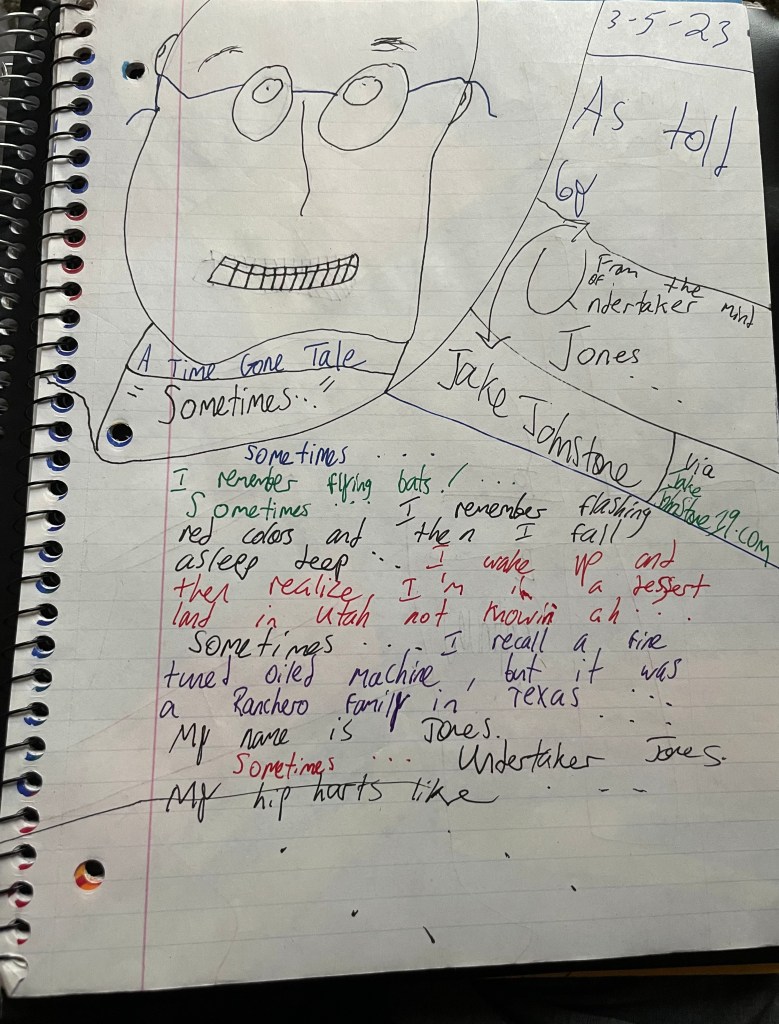Sometimes … I remember flying bats! … Sometimes … I remember flashing red colors and then I fall asleep deep … I wake up and then realize I’m in a desert land in Utah not knowin’ ah … Sometimes … I recall a fine-tuned oiled machine, but it was a Ranchero family in Texas … My name is Jones. Sometimes … Undertaker Jones. My hip hurts like … … …