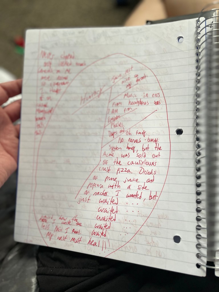 Hungry … Juice felt nice on my throat. The music in my ears from my headphones was 3AM from Eminem. Phases. Days and. Oh funny. No nerves-bunny. System honey, but the Acme was sold out of cauliflower crust pizza. Drinks of prune juice and popcorn with a side of nachos. I wanted but just waited … waited … waited … waited … waited … weird how the more I write the less pain I feel. My wrist must heal!!!