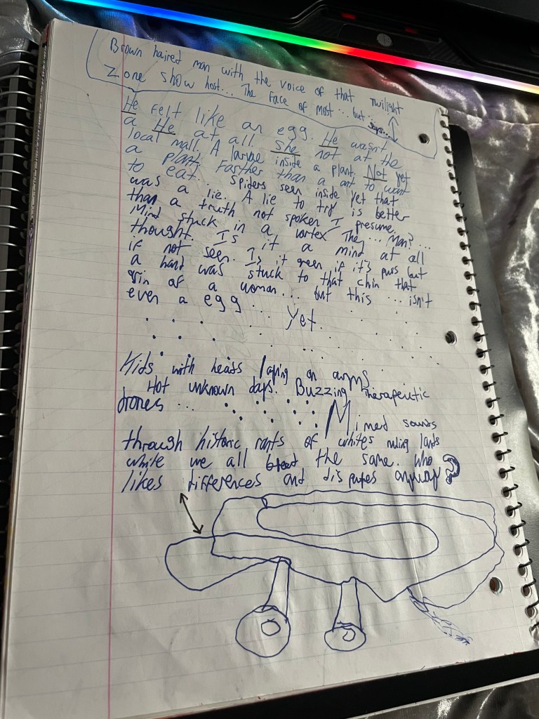 He felt like an egg. He wasn’t a He at all. She is not at the local mall. A larvae inside a plant. Not yet a plant. Farther than an ant to want to eat. Spiders seen inside yet that was a lie. A lie to try is better than a truth not spoken I presume. Mind stuck in a vortex The … Man? … thought. Is it a mind at all if not seen. Is it green if it’s puss but a hand was stuck to that chin that grin of a woman … but this … isn’t even an egg. .. yet … … … … … … … … … … Kids with heads laying on arms. Hot unknown days. Buzzing therapeutic drones … … … … … … Mimed sounds through historic rants oh whites ruining lands while we all bleed the same. Who likes differences and disputes anyway?