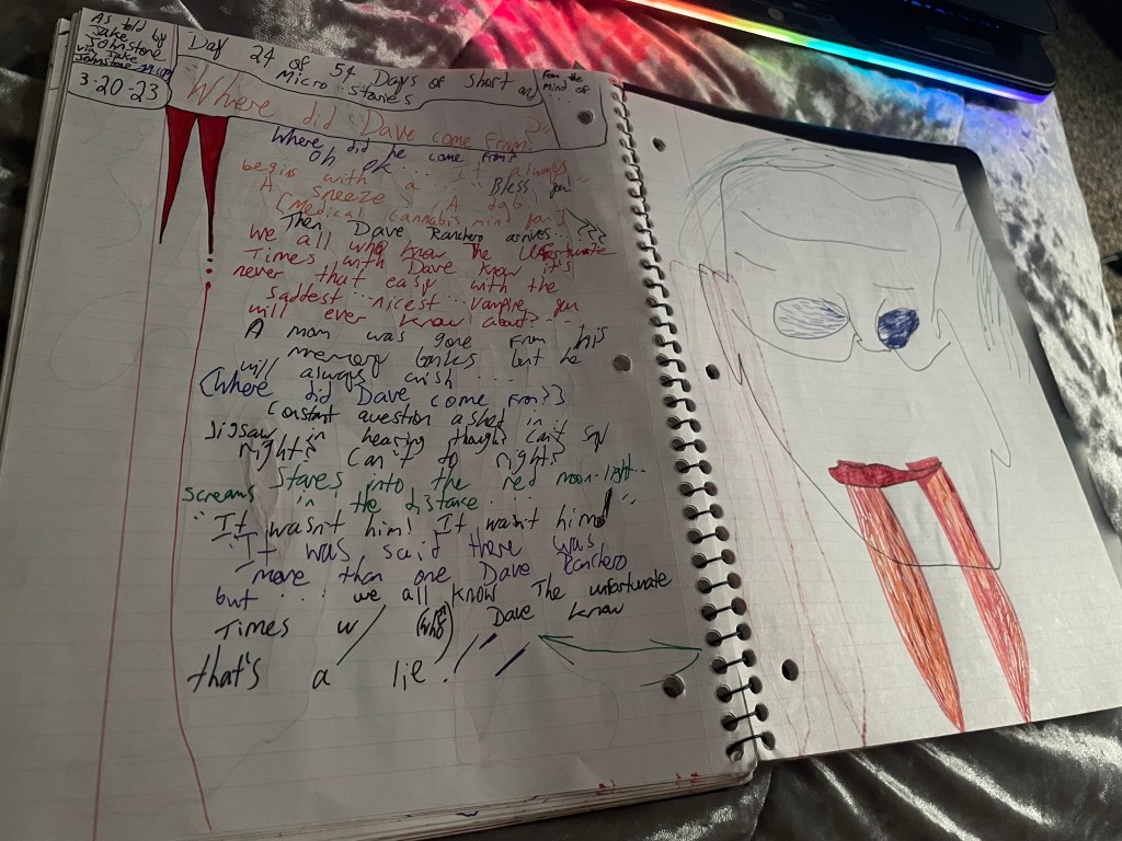 Where did he come from? Oh ok … It always begins with a … ” Bless you! ” A sneeze! A dab! [ Medical Cannabis mind you ] Then Dave Ranchero arrives … We all who know who The Unfortunate Times With Dave know it’s never that easy with the saddest … nicest … vampire you will ever know about? … A mom was gone from his memory banks but he will always wish … { Where did Dave come from } Constant question asked in. Jigsaw in hearing though? Can’t say right? Can’t do right? Stares into the red moonlight … Screams in the distance … ” It wasn’t him! It wasn’t him! ” ” It was said there was more than one Dave Ranchero but … we all know The Unfortunate Times w/ (who) Dave know that’s a lie! ”