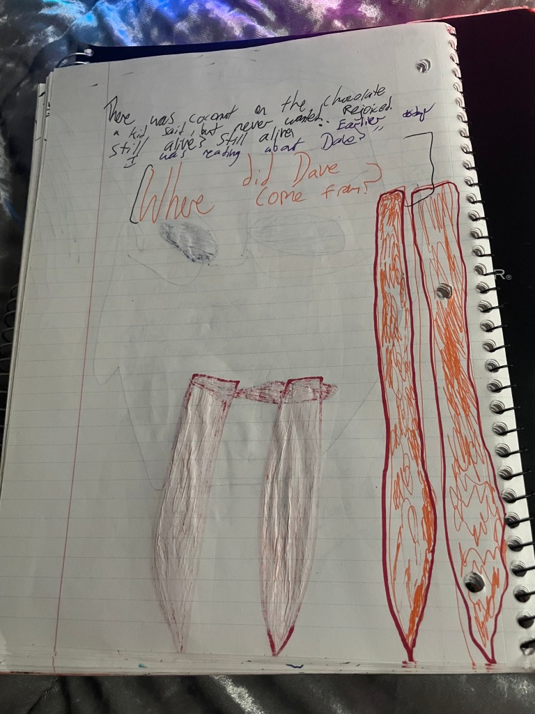 There was coconut on the chocolate a kid said, but never wanted. Rejoiced. Still alive? Still alive! ” Earlier today I was reading about Dave? ” [ Where did Dave Come from? ]