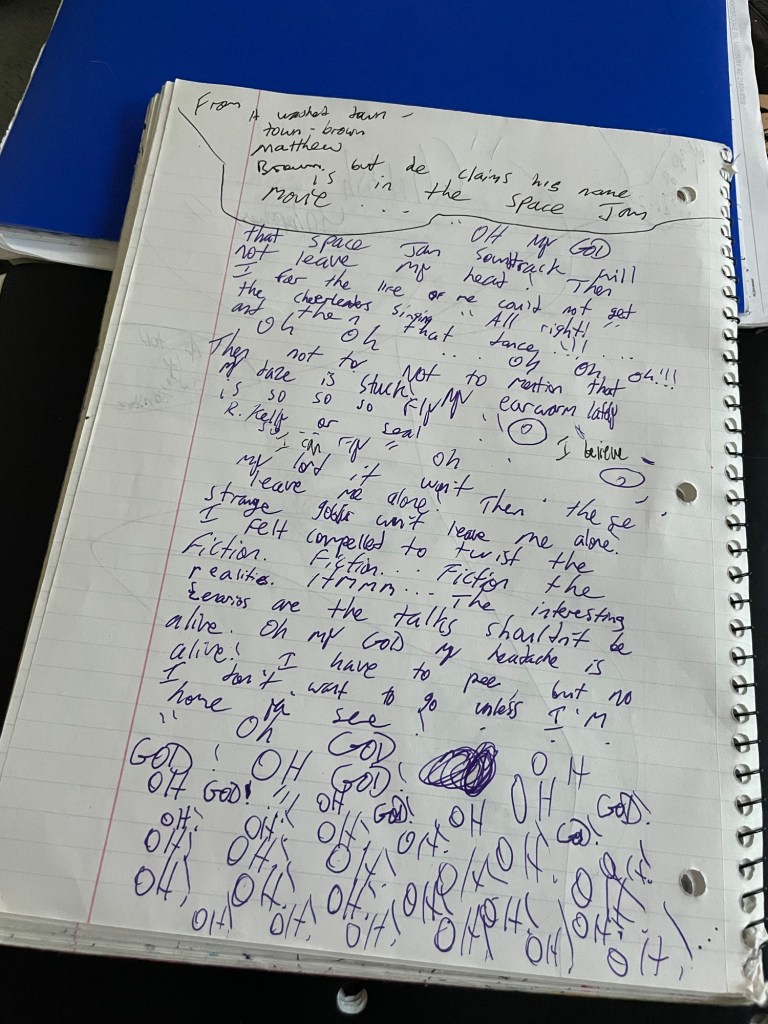 “ OH MY GOD that Space Jam Soundtrack will not leave my head! Then I for the life of me could not get the cheerleaders singing “ All Right! Here’s your chance! Take your dance at the Space Jam! Alright! “ … Then not to mention that my daze is stuck! My earworm lately is so so so fly! “ I believe I can fly! “ Oh … My lord it won’t … leave me alone! Then these strange goblins won’t leave me alone! I felt compelled to twist the fiction. Fiction… Fiction … Fiction the realities. Hmmm… The interesting scenarios are the talks shouldn’t be alive! I have to pee, but no I don’t want to go unless I’m home ya see! … “ Oh GOD OH GOD! OH GOD! OH GOD! OH GOD!!! OH GOD!!! OH! OH! OH! OH! OH! OH! OH! OH! OH! OH! OH! OH! OH! OH!OH! OH! OH! OH! OH! …