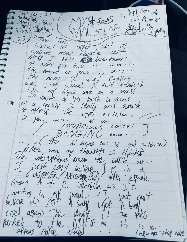 “ Where were my thoughts I think? The interruptions around the world, but… I just can’t believe I’m in a ‘CUSTOMER/NEIGHBORHOOD WARS’ episode from A&E. Trembling as I’m writing in my journal… I just can’t believe it! Yes! A baby cried! A baby cried again! The vehicle is two spots parked to the right of me, it is on… appears maybe locked … (New age they have HaVe the key), but even though it is 52 degrees outside and in February… Is this still ok I’m thinking? I’m not going to … but I’m not going to say I didn’t think to … then … the mother returns to said red Dodge SUV … … … … … … … … … … … … … … “