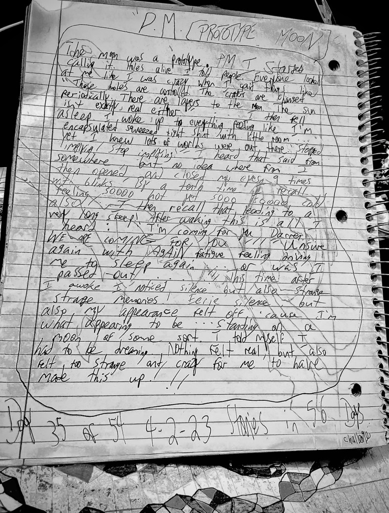 “ The moon was a prototype. PM I started calling it. Holes alive I told people. Everyone looked at me like I was crazy when I said things like “ Those holes are controlled. The craters are changed periodically. There are layers to the moon. The sun isn’t exactly real either. “ … I then fell asleep. I woke up to everything feeling like I’m encapsulated squeezed tight shut with little room … Yet I knew lots of worlds were out there! ‘ Stopped implying! Stop implying! “ I heard that said from somewhere, but no idea where from… I then opened, and closed my eyes 9 times with blinks! By a tenth time I recall feeling sooooo hot yet sooooo soooooooo cold also!… I then recall that leading to a very long sleep! After waking this is all I heard: “ I’m coming for you Darren … WE ARE COMING FOR YOU!!!” Unsure again with AGAIN fatigue feeling driving me to sleep again … !!! This time after I woke I noticed silence but also strange strange memories! Eerie silence, but also my appearance felt off ‘cause I’m what, appearing to be … standing on a moon of some sort. I told myself I had to be dreaming. Nothing felt real, but also felt too strange and crazy for me to have made this up!!!”