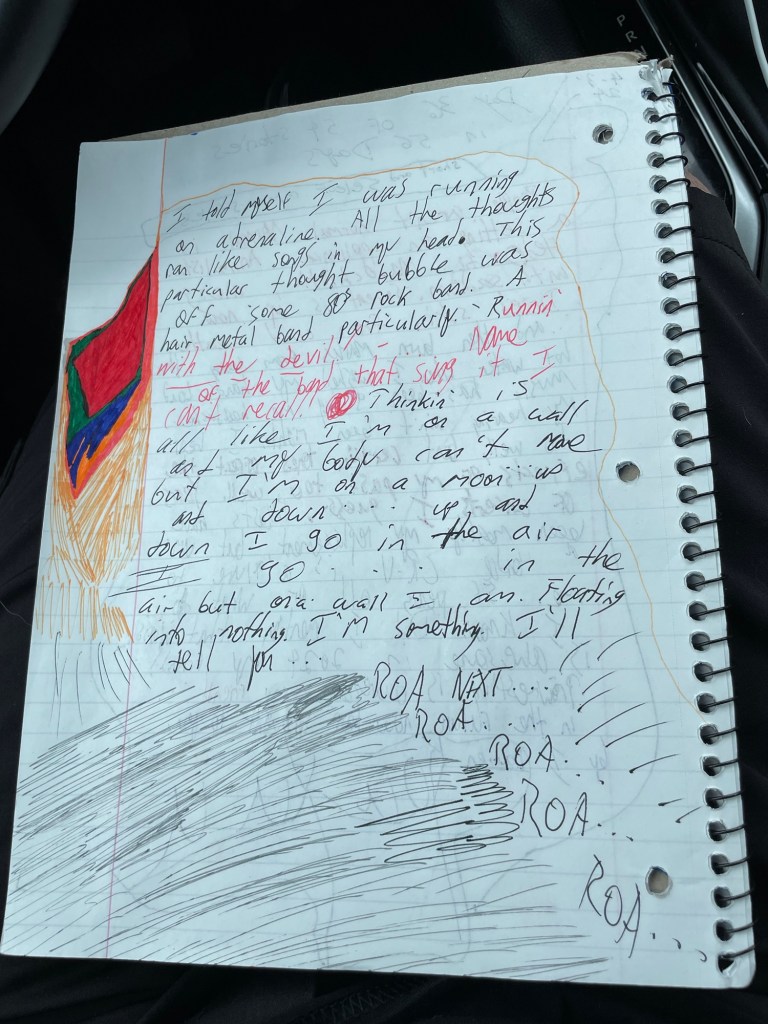 “ I told myself I was running on adrenaline. All the thoughts ran like songs in my head. This particular thought bubble was off ‘some 80s rock band. A hair metal band particularly. ‘Runnin’ with the devil!’-… Name of the band that sung it I can’t recall! Thinking is all like I’m on a wall and my body can’t move but I’m on a moon … up down I go in the air I go … in the air but on a wall I am. Floating into nothing. I’m something. I’ll tell you … ROA NEXT … ROA … ROA… ROA… ROA … “