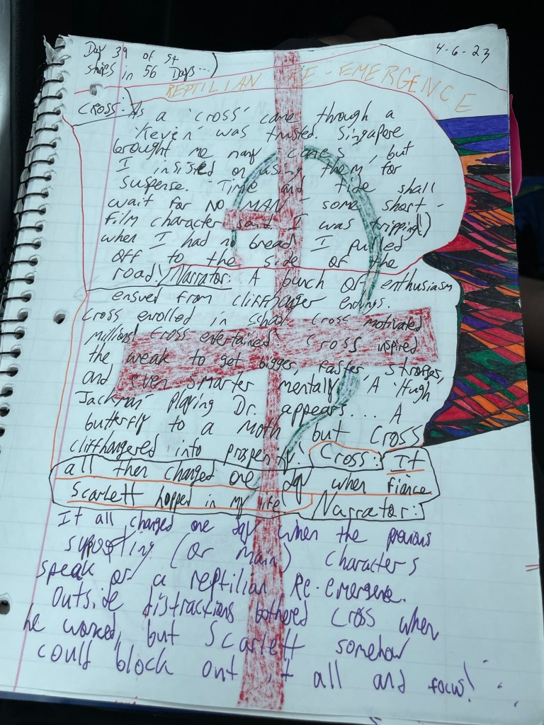Cross: “ As a ‘cross’ came through a ‘Kevin’ was trusted. Singapore brought me many canes, but I insisted on using them for suspense. ‘Time and tide shall wait for NO MAN’ some short-film character said. I was tripping(!) when I had no bread! I pulled off to the side of the road!